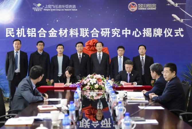 南山鋁業(yè)總經(jīng)理呂正風(fēng)、中商飛上海飛機(jī)設(shè)計(jì)研究院總會(huì)計(jì)師王君君簽署協(xié)議