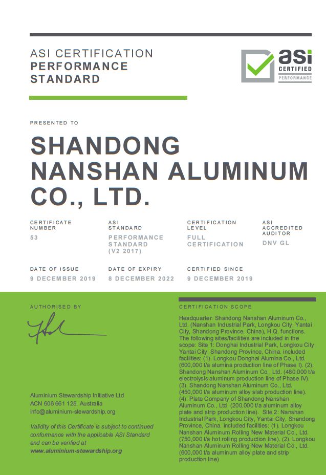 山東南山鋁業(yè)股份有限公司作為中國鋁加工行業(yè)的代表,秉承“綠色制造,鑄就企業(yè)美好未來”的可持續(xù)性發(fā)展理念,于2018年7月率先加入了ASI組織,成為ASI生產(chǎn)和轉(zhuǎn)化加工類的會員。其下屬子公司煙臺東海鋁箔有限公司于2019年1月份順利通過了ASI績效認證和ASI監(jiān)管鏈雙認證,成為中國首家獲ASI雙標準認證的公司。為了促進鋁產(chǎn)業(yè)鏈的可持續(xù)發(fā)展,本著對社會負責任的態(tài)度,山東南山鋁業(yè)股份有限公司于2019年3月份開始著手推行全產(chǎn)業(yè)鏈的ASI認證,將ASI認證范圍延伸至氧化鋁、鋁冶煉、重熔/精煉、熔鑄、熱軋、冷軋、精整的鋁產(chǎn)業(yè)鏈,認證產(chǎn)品涵蓋了冶金級砂狀氧化鋁粉、電解鋁水、扁錠、熱軋卷、罐料、鋁箔產(chǎn)品、航空板、汽車板等。2019年9月底順利通過了DNV-GL(上海挪華威認證有限公司)審核專家對南山鋁業(yè)產(chǎn)業(yè)鏈ASI績效標準體系的現(xiàn)場審核,成為全國首家推行并通過ASI鋁產(chǎn)業(yè)鏈認證的企業(yè)。