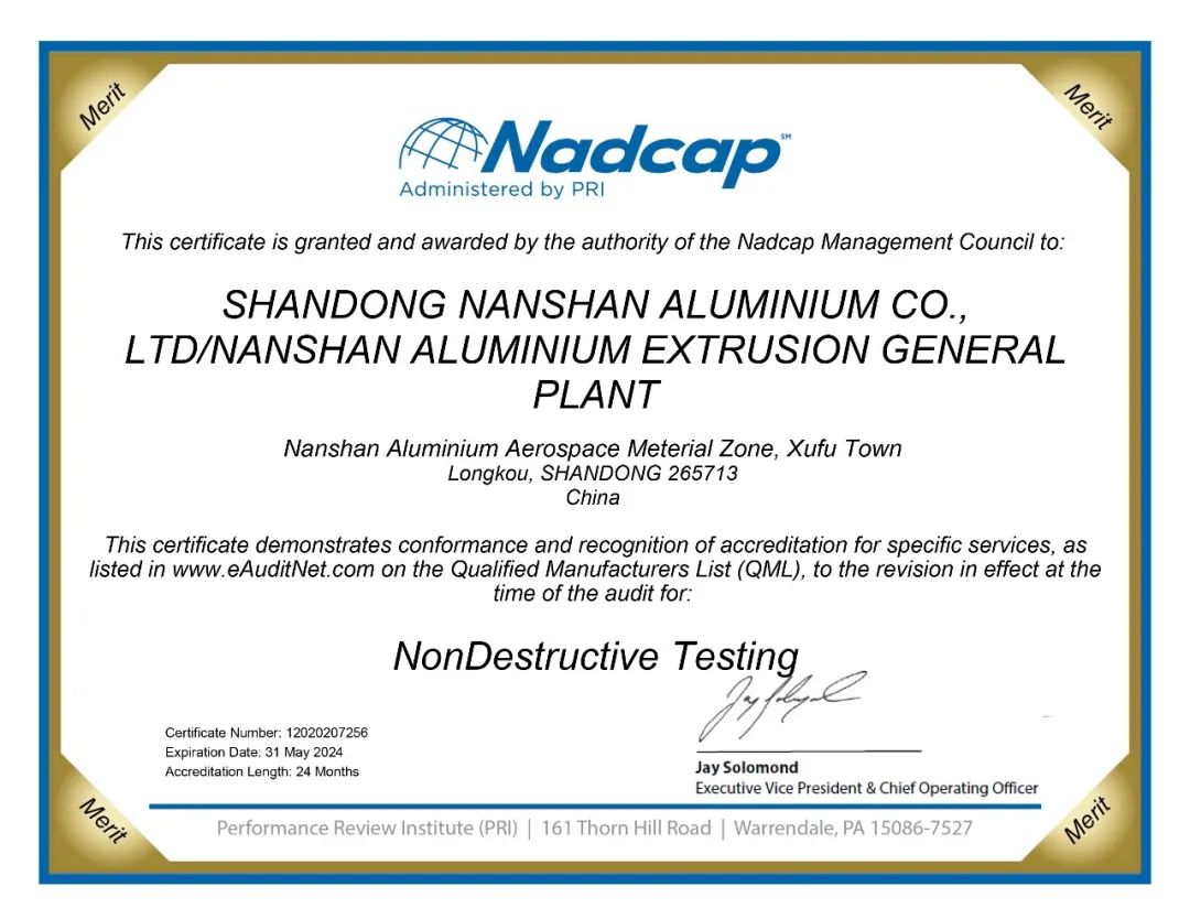 近日,從PRI(國際質量評審協會)認證官方網站eAuditnet獲悉,南山鋁業股份有限公司鋁材公司航空事業部Nadcap無損檢測獲得24個月認證周期,成為南山鋁業第二家獲得NADCAP NDT特種工藝認證最高認證周期獎勵殊榮的企業。
