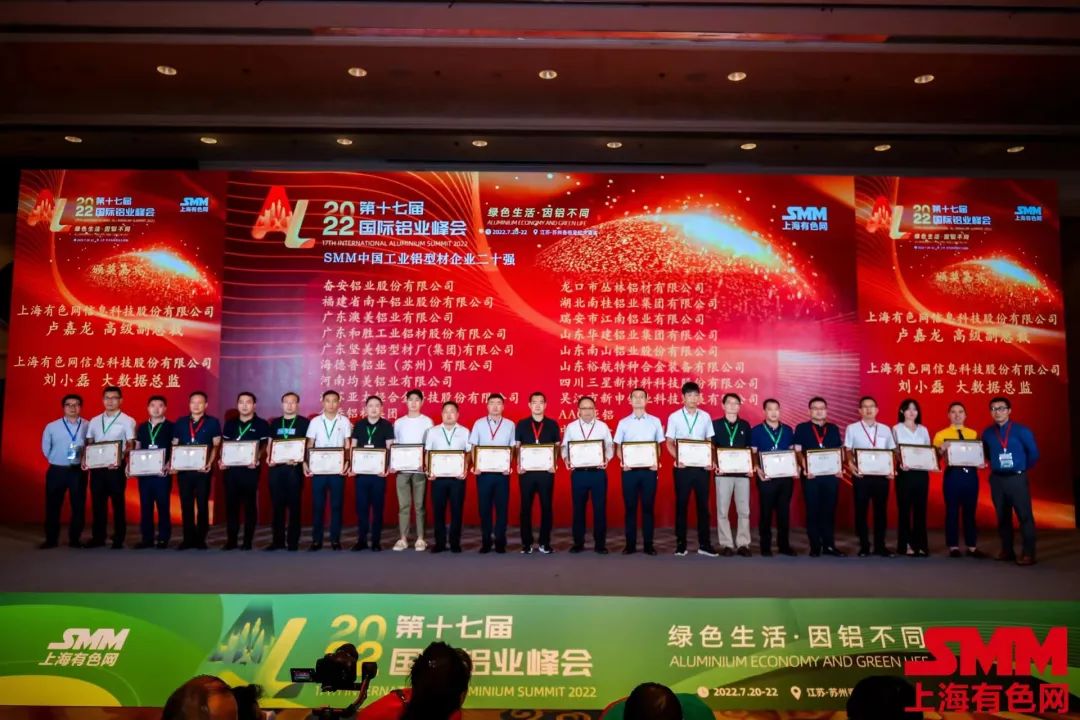 7月20日-22日,2022年SMM(第十七屆)國際鋁業(yè)峰會(huì)在江蘇蘇州舉行。山東南山鋁業(yè)股份有限公司旗下鋁材公司和板帶事業(yè)部分別獲得“中國工業(yè)鋁型材企業(yè)二十強(qiáng)”和“中國鋁板帶箔企業(yè)二十強(qiáng)”榮譽(yù)稱號。